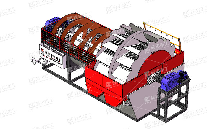 該設備主要分為洗砂部位和細砂回收部位;洗砂部位和一般的輪式洗砂機大致相同,但是在該部位中加入隔板能同時清洗兩種不同粒徑的顆粒,實現洗砂、脫水、脫泥功能。細砂回收部位和傳統的利用旋流器回收細砂有所不同,該設備利用大直徑、低轉速螺旋葉輪將螺旋水槽中沉淀的細砂緩慢的推入輪洗槽內,再由輪斗帶出,經過細砂沉淀后的泥漿水從螺旋尾端溢流出去。與此同時,在螺旋水槽尾部設有可調節的溢流堰板,可通過調節堰板高低來控制細砂回收量。